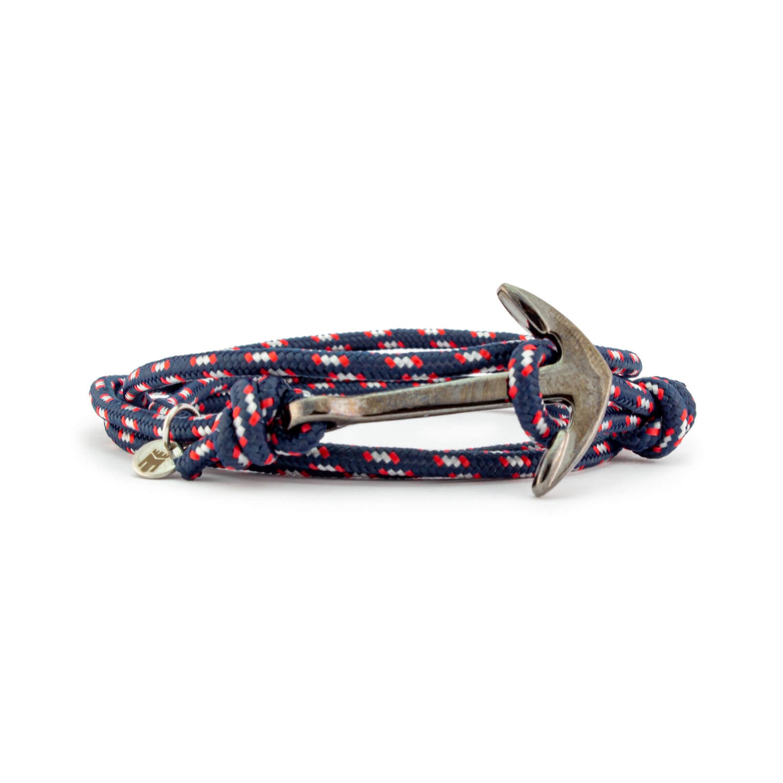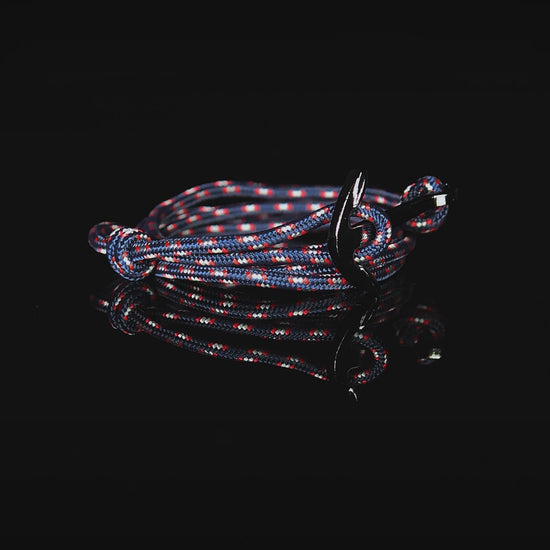 Con una cuerda azul oscura con detalles en rojo y blanco, y un ancla negro cromado, esta pieza se destaca por su diseño náutico único. Además, su talla ajustable asegura un ajuste perfecto y cómodo, mientras que el material de paracord garantiza durabilidad.