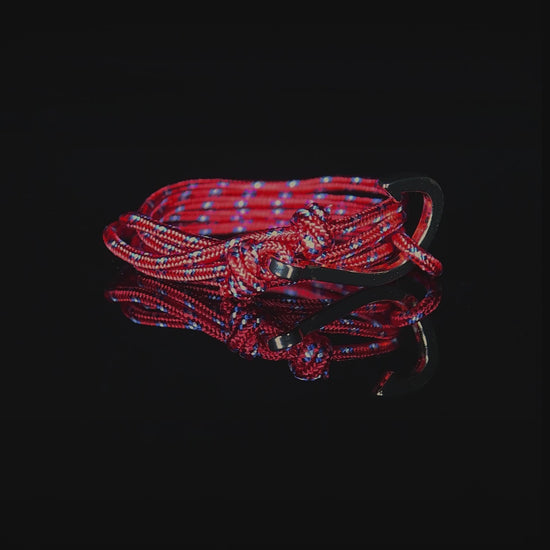Descubre la Pulsera de Anzuelo - Alessandria de Magma, un accesorio para hombre que transforma cualquier look. Con cuerda tipo paracord en rojo obscuro con detalles en azul y blanco, y un anzuelo dorado como cierre, esta pulsera combina elegancia y estilo arriesgado. Su diseño es perfecto tanto para un look elegante como casual, o incluso para llevar en un día de playa.