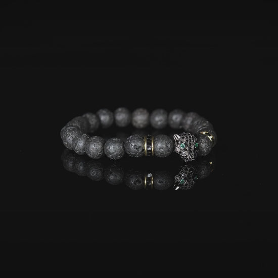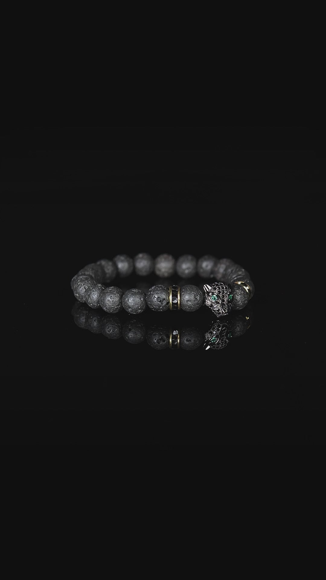 Pulsera de piedra volcánica con dije de jaguar, te brinda un estilo elegante y arriesgado, ideal tanto para un look elegante, casual, o más relajado.